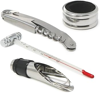 • 4 teiliges Set mit Flaschenöffner, tropfring, Weinausgiesser und Wein Thermometer